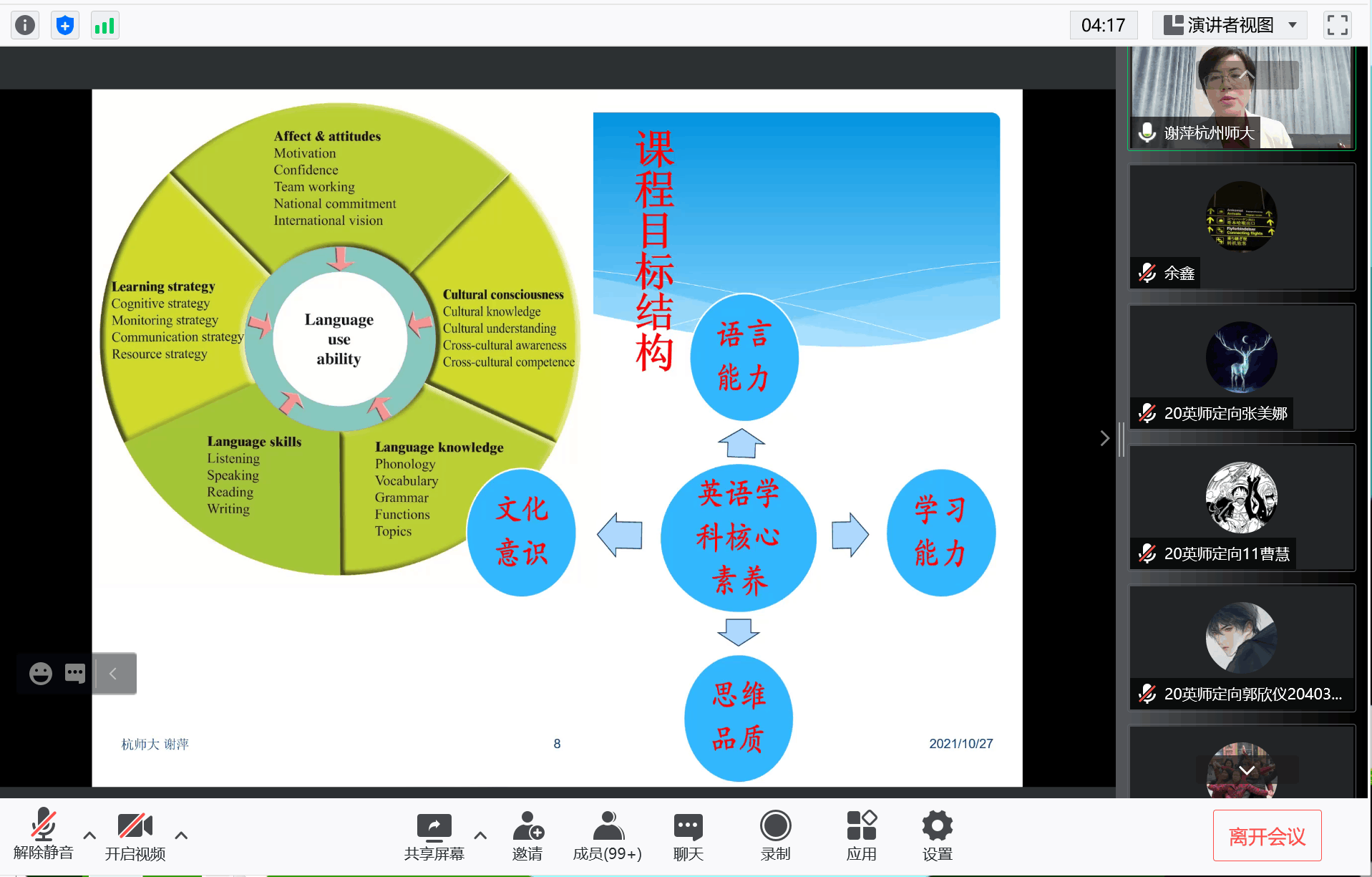 张莉进行讲座总结。她指出本次讲座谢萍教授身体力行,以互动和浸入模式,将深度学习理念深深植入与会者的教学理解和教学思考,良好地推动了与会师生的教学观念发展和教学改革创新,是外国语学院“新文科”建设实践中,校际合作,融通资源,助推师范生学科专业能力发展和就业竞争力提升的又一次积极探索。