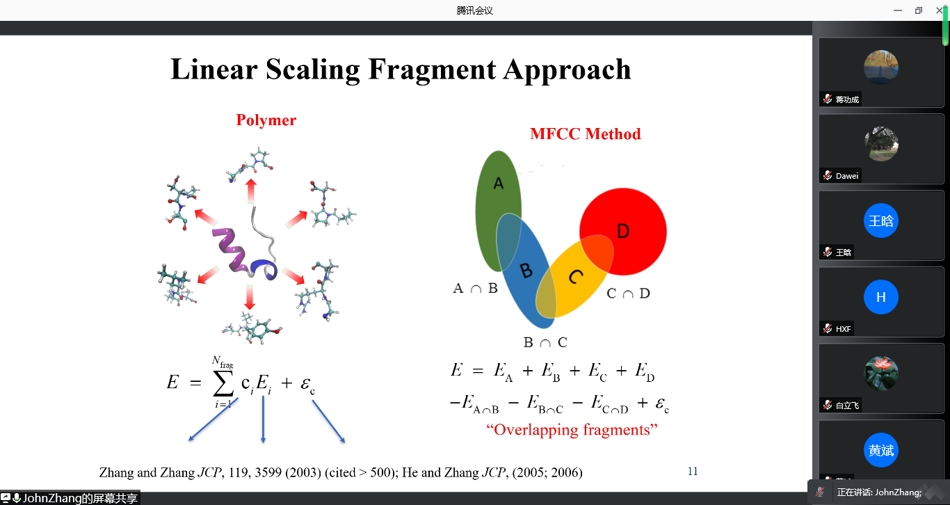 张教授在报告中详细介绍了该课题组近些年的研究成果,涵盖了针对生物大分子的量子分块计算方法开发,蛋白体系的分子动力学模拟方法与应用,蛋白-小分子的结合模式、蛋白-蛋白相互作用、复合物的结构预测及相互作用结合自由能的精确高效计算,应用量子化学与人工智能的深度融合来研究模拟复杂化学反应等。这些方法的开发与应用为研究和认识蛋白-配体相互作用、蛋白-蛋白相互作用、酶催化反的特征等提供了重要和精确定量的信息,对药物设计,抗体设计和蛋白设计提供具有实际意义的理论计算指导。报告结束后,大家就关心的科研细节问题与张教授进行了深入探讨,张教授耐心细致地逐一解答,参会老师们颇感受益。
