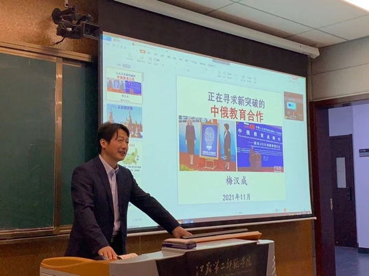 梅汉成教授刚刚结束中国驻俄罗斯使馆教育处的工作任期回国,为我校师生带来最新的中俄人文教育交流信息。讲座首先从宏观角度全面分析了中俄人文教育交流的重要性以及近年来取得的巨大成就。梅教授特别提到,中俄两国关系现处于历史最好时期,两国领导人共同宣布共建新时代全面战略协作伙伴关系,极大地推动了中俄关系的进一步发展,同时也为世界和平建设提供了可借鉴的经验策略。国际交流与和平事业需要有国际化人才,而教育合作是培养此类人才的保证。讲座第二部分则聚焦中俄教育合作特别是高等教育的合作。梅教授生动详实地呈现了中俄教育交流实践成果,同时指出存在的问题和挑战,揭示中俄教育正在寻求新的突破,鼓励青年学生积极参与中俄教育交流,为建设地区与世界和平作出自己应有贡献。最后师生们和梅教授开展了热烈的交流。
