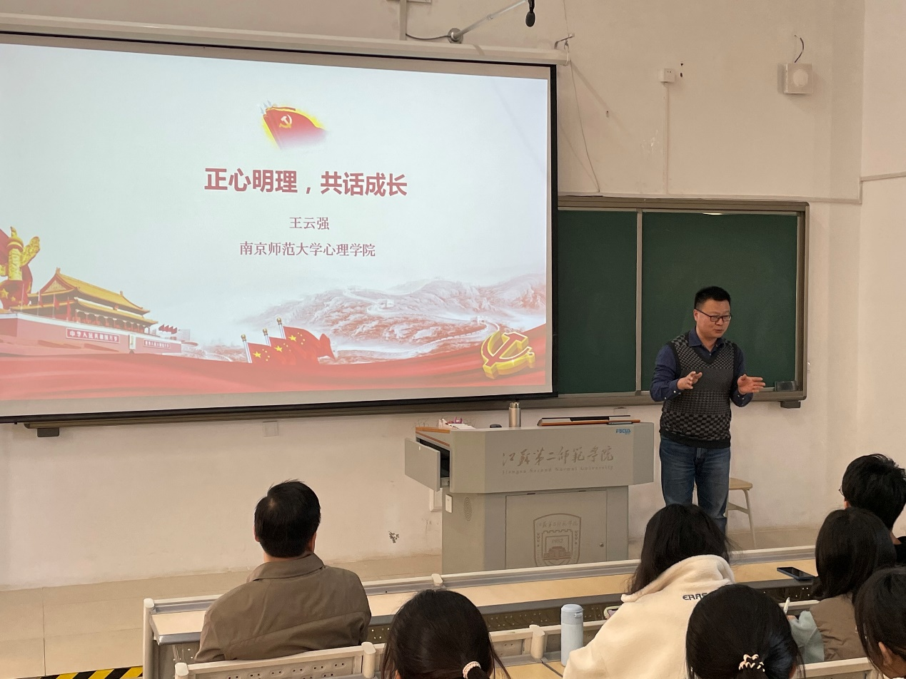 2021年11月24日,南京师范大学心理学院副院长王云强教授应邀来校在石湫校区博3-202为教育科学学院师生做了题为“正心明理,共话成长”的讲座。教育科学学院教师及全体大一学生到场聆听讲座,学院院长蒋波教授主持讲座。