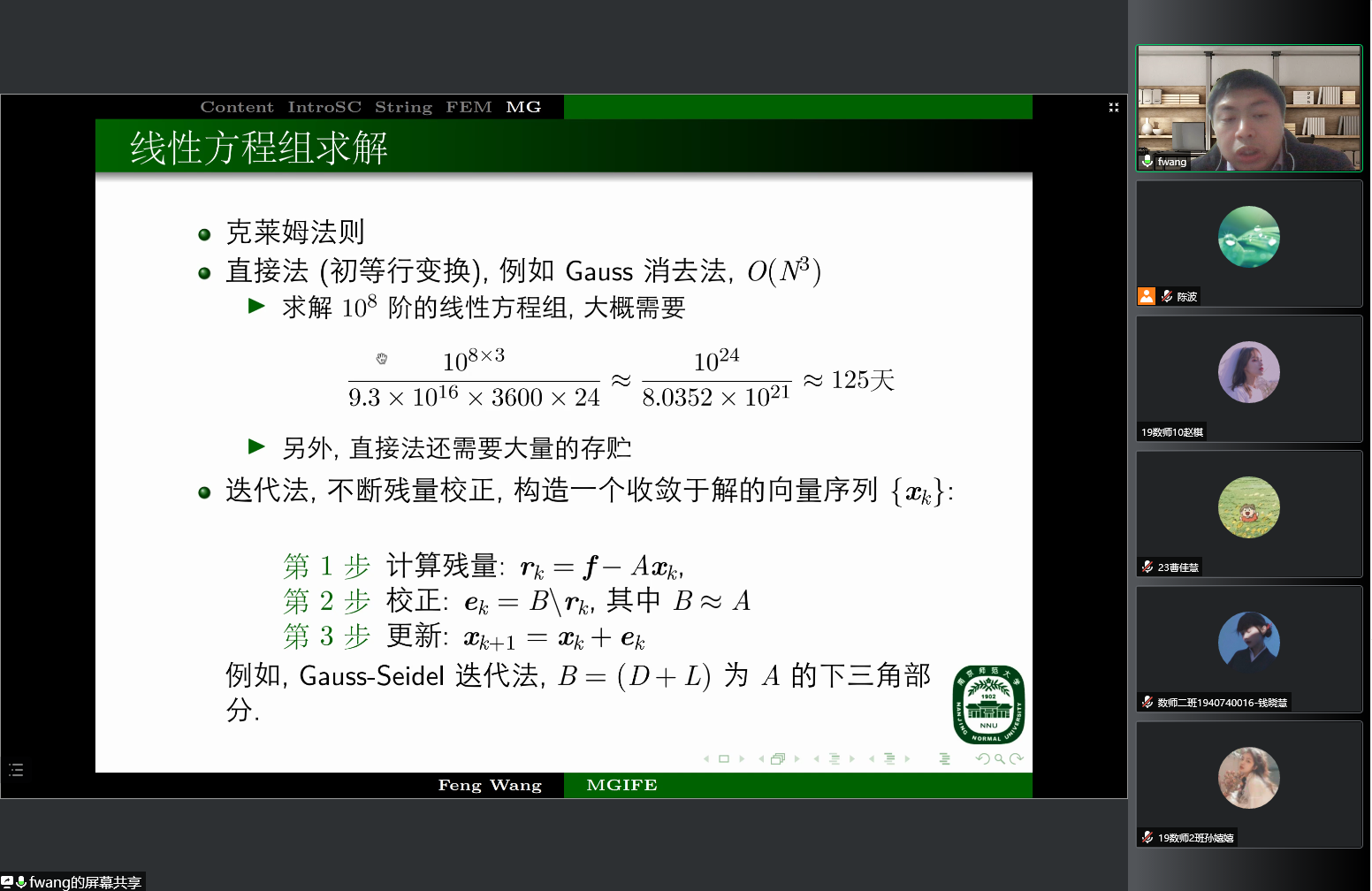 首先,王老师介绍了什么是科学计算,指出计算数学的核心是找到快速、有效的算法,让计算机的威力最大化发挥出来,并结合挪威Sleipner A 海上石油平台沉没、阿丽亚娜5型运载火箭爆炸等案例强调计算精度的重要性。接着,围绕弦振动问题,王老师介绍了数学模型的建立、解的存在性分析以及求解的具体方法;结合变分问题,介绍了有限元方法的主要思想、误差估计及相关结论、求解线性方程组的多重网格算法及自己最近在该方法的研究上取得的一些成果。
