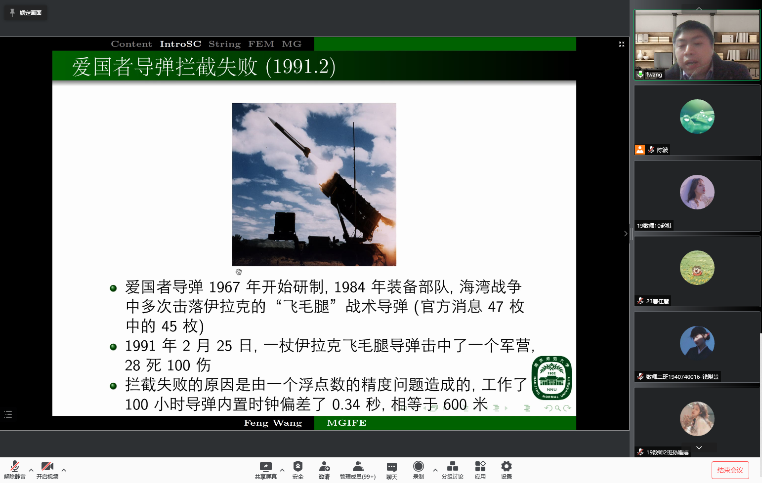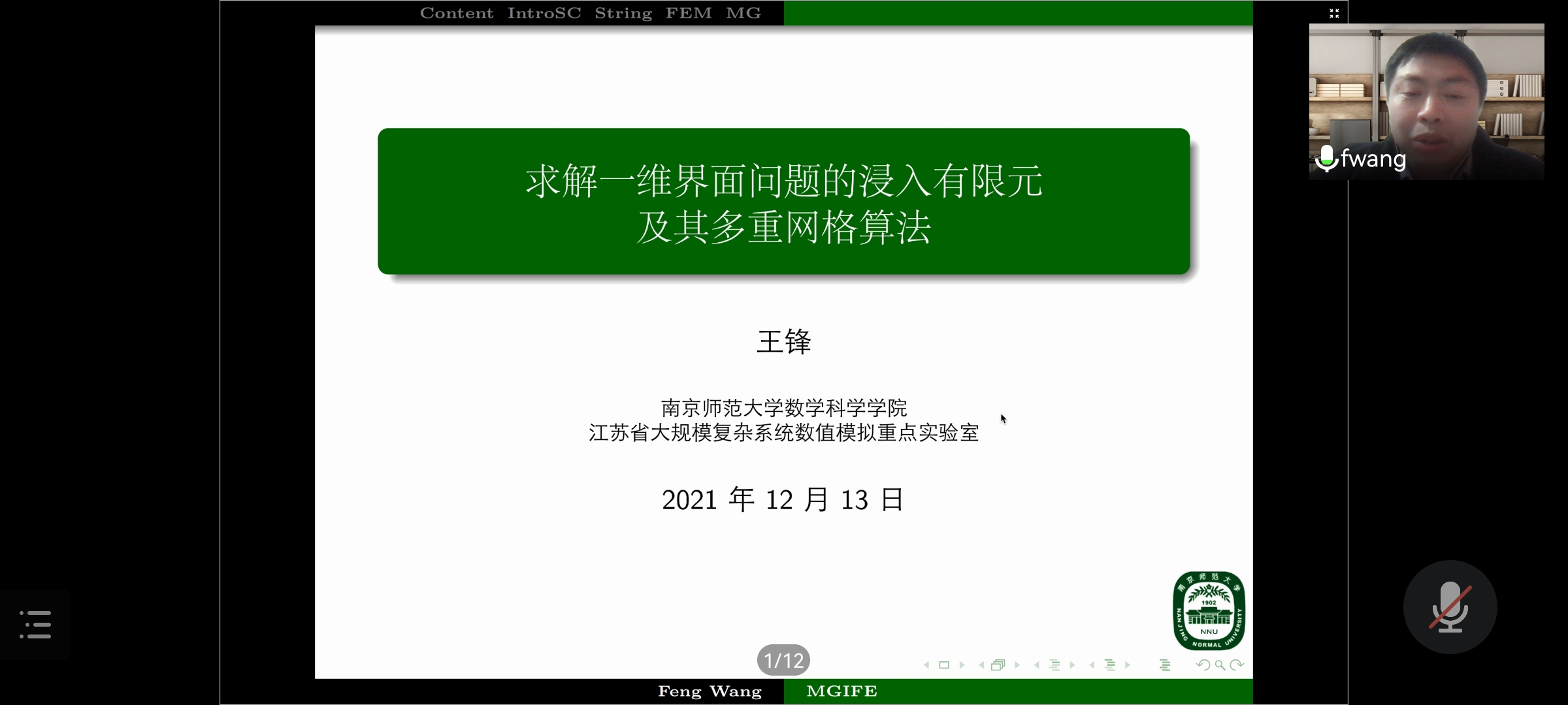 2021年12月13日,南京师范大学数学科学学院副院长王峰老师应邀为我院师生开设主题为“求解一维界面问题的浸入有限元及其多重网格算法”的学术讲座。讲座采取“腾讯会议”方式进行,由数信学院副院长陈波主持,数信学院100余名师生在线聆听。