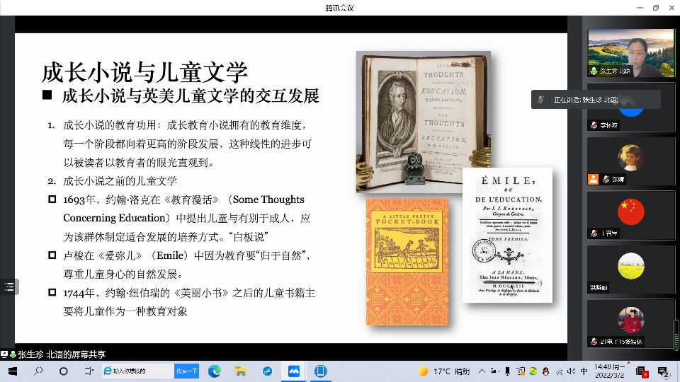 2022年3月2日,北京语言大学博士生导师张生珍教授应邀为外国语学院师生做“成长小说、儿童文学与跨界文学的渊源”的线上专题讲座。外国语学院院长张莉教授主持讲座,学院全体教师及部分学生聆听了讲座。