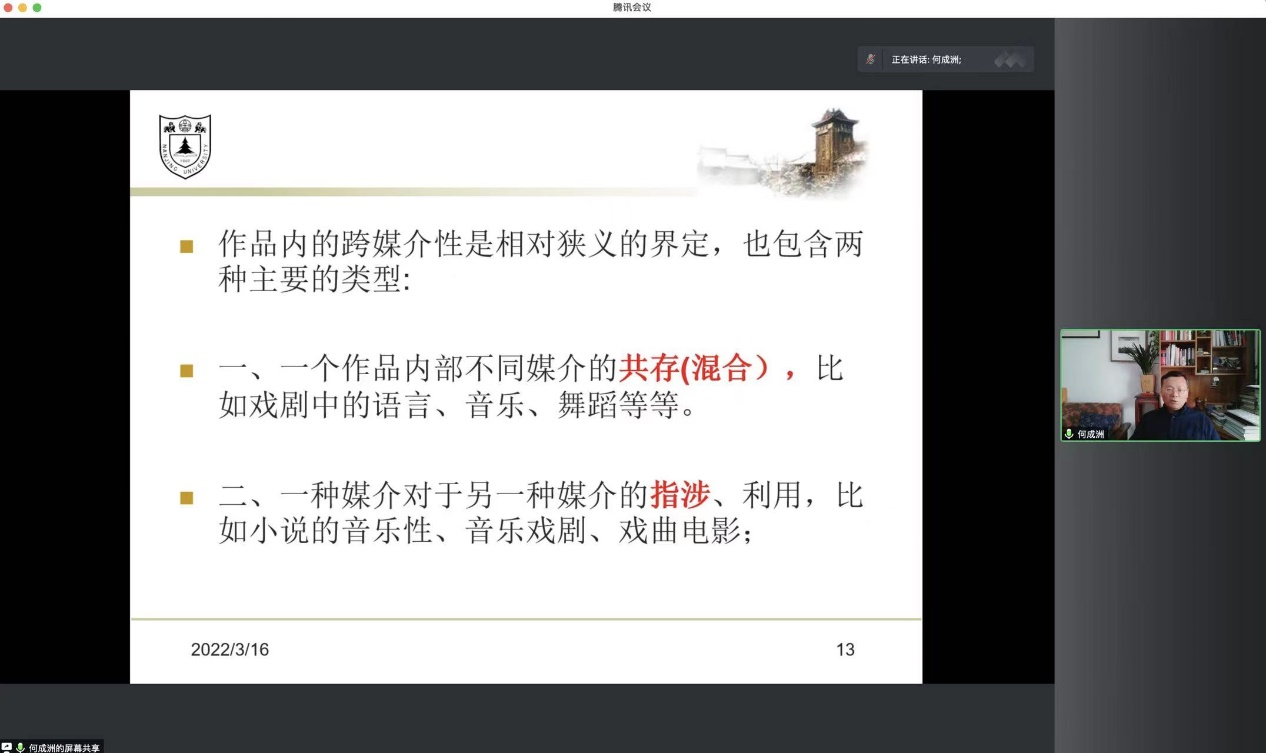 2022年3月16日下午,南京大学艺术学院何成洲教授在美术学院举办了题为《艺术学研究的新问题》线上讲座。讲座由美术学院院长路明教授主持,美术学院全体教师、学生代表线上学习。