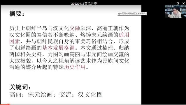 2022年4月13日,中国美术家协会会员、江苏省国画院傅抱石纪念馆馆长,江苏省美术家协会理事、江苏美协理论艺委会委员黄戈教授应邀为美术学院美术学专业师生作题为《高丽与宋元的绘画交流》的在线学术讲座。讲座由美术学院副教授徐声主持。