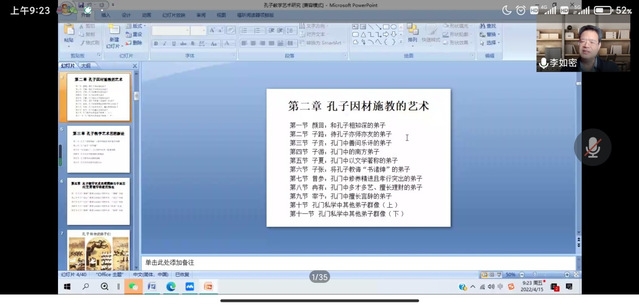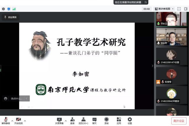 2022年4月15日,“笃行”系列讲座第二十八讲“孔子教学艺术研究——兼谈孔门弟子的‘同学圈’” 在线上顺利举行。本次讲座的主讲人是南京师范大学课程与教学研究所所长、博士生导师李如密教授。主持人由文学院贡如云教授担任,百余名学生在线聆听了本场讲座。