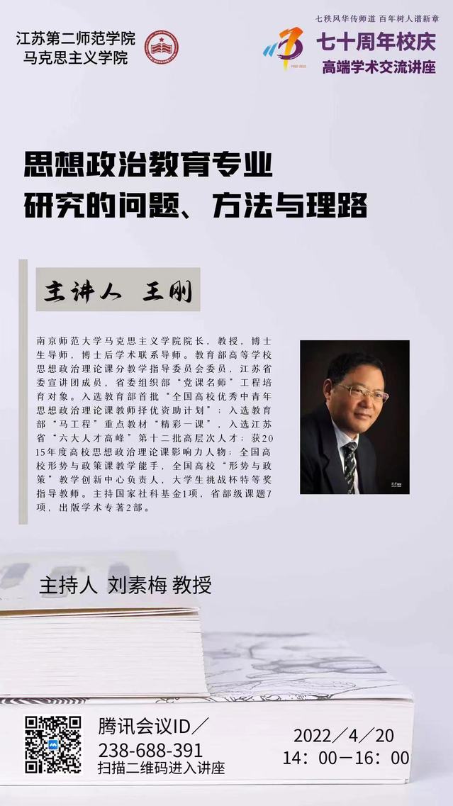 2022年4月20日,马克思主义学院邀请了南京师范大学王刚教授为全院师生开展了题为“思想政治教育专业研究的问题、方法与理路”的线上专题讲座。王刚教授系南京师范大学马克思主义学院院长、教授、博士生导师、博士后学术联系导师。