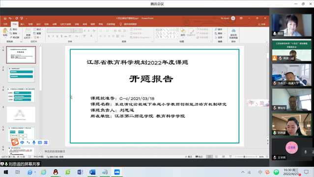 为推进项目研究进度,保障项目研究质量,2022年4月27日,教育科学学院举行江苏省教育科学“十四五”规划课题线上开题报告会。学院特邀南京师范大学博士生导师谭顶良教授、南通大学教育科学学院院长沈永江教授、淮阴师范学院教育科学学院院长曹如军教授参加论证指导。我院2021年度立项的四个课题组全体成员参加会议。会议由教科院郑洁副院长主持。