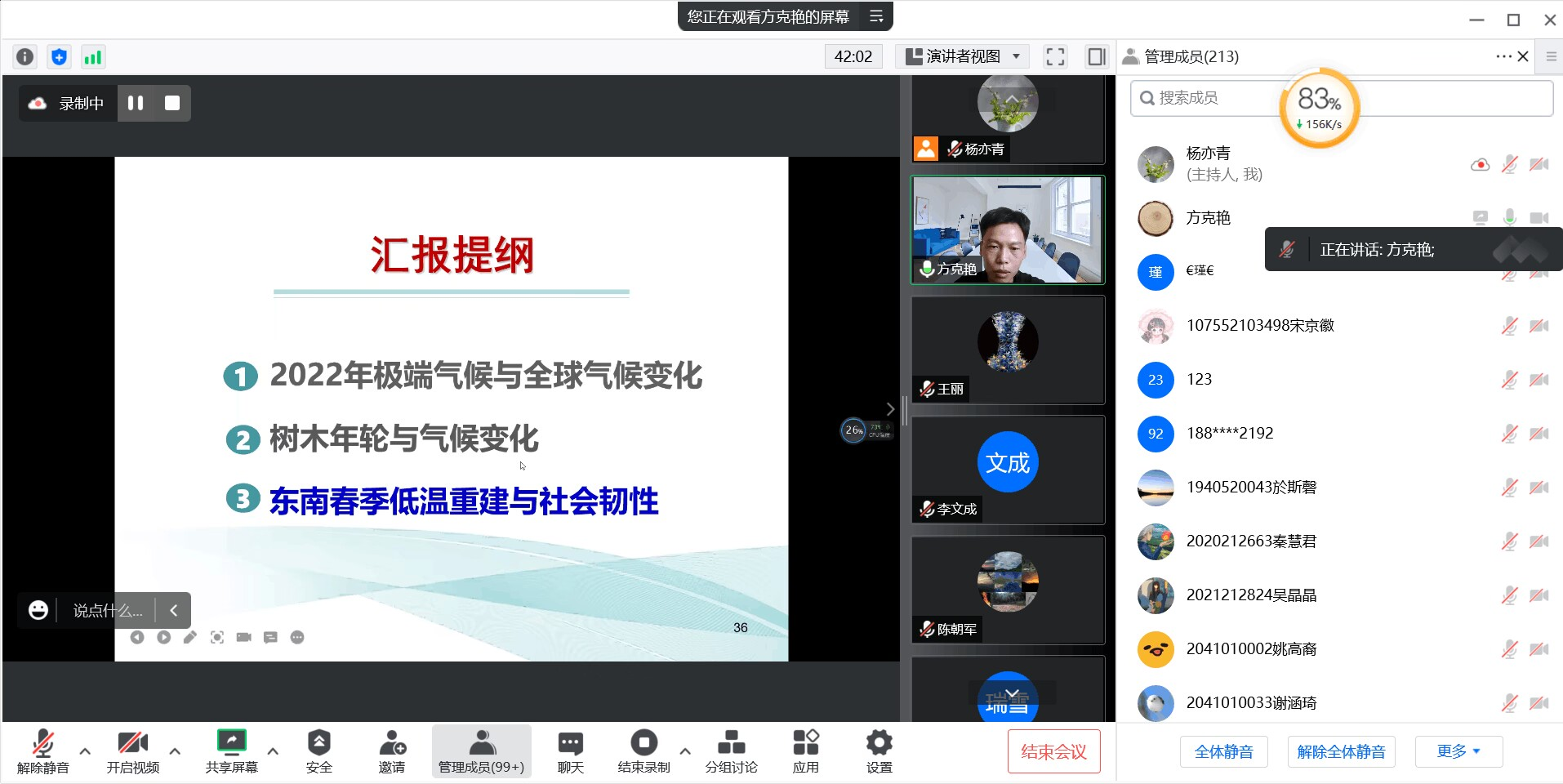 方克艳教授,是国家自然基金委“优青”和中组部万人计划“青拔”。以第一或通信作者在Nat. Commun.和Sci. China Earth Sci.等SCI期刊上发表50余篇,被Nature、Science等SCI期刊广泛引用。共发表文章100余篇。讲座从极端气候与全球气候入手,分析全球变暖气候异常与树木年轮研究之间的联系,从科普的角度整体介绍树轮研究的独特性,树轮规律与气候变化规律的关联性,并对相关领域的研究予以对比,对历史时期人类活动对气候的影响在树轮上的反应提出了自己的见解。最后,方教授对自己的研究成果《东南春季低温重建与社会韧性》进行了深入介绍。