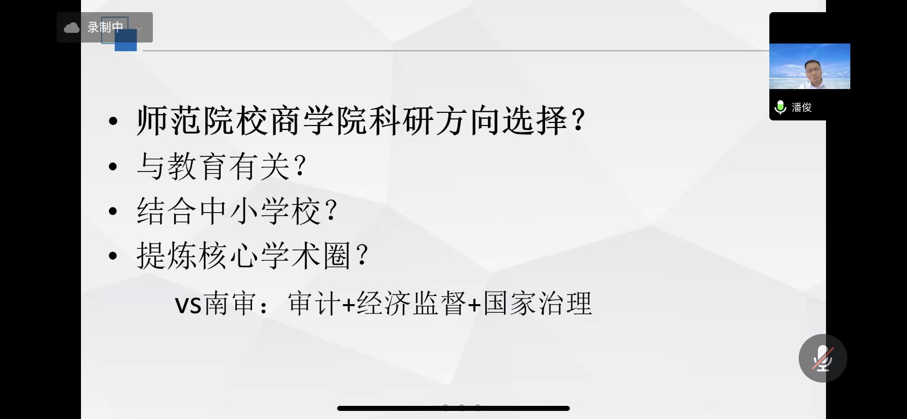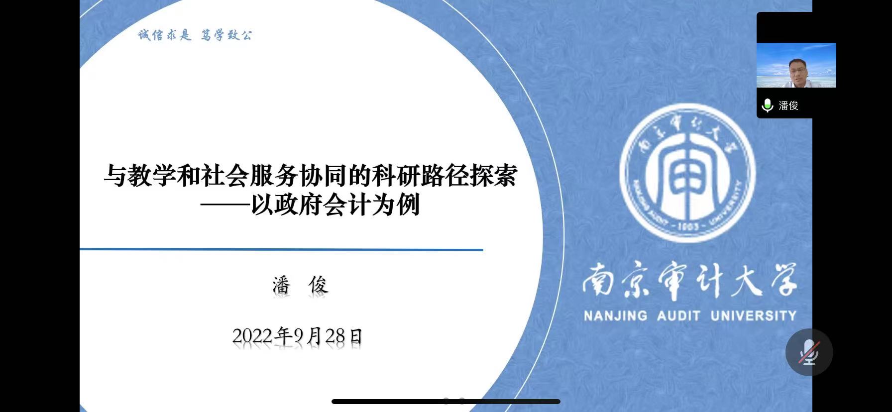 9月28日下午,南京审计大学会计学院副院长潘俊教授应邀到商学院做题为《与教学和社会服务协同的科研路径探索——以政府会计为例》的讲座。本次报告通过腾讯会议开展,商学院副院长张敏主持会议,商学院全体教师参加了此次讲座。
