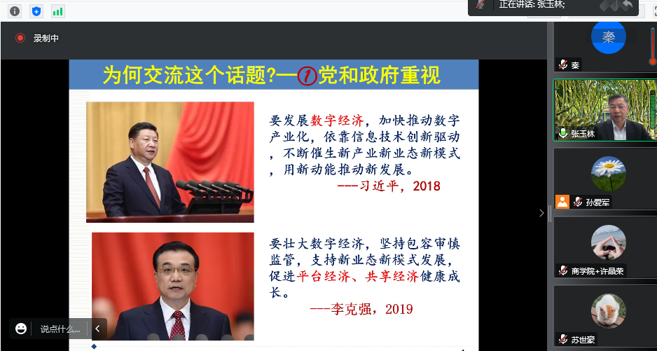 张教授首先深入讨论了互联网平台发展的重要性,加强互联网平台的研究能更好地发展数字经济,加快推动数字产业化。其次,张玉林教授重点讲述了互联网平台兴起、发展变迁、研究思考等方面的问题,阐释了互联网平台在目前经济中的重要性,并结合“滴滴”“微信”等企业的运营模式及发展状况展开深入探讨。讲座尾声,张教授就信息价值和信息行为等前沿问题和与会师生进行了深入的交流。