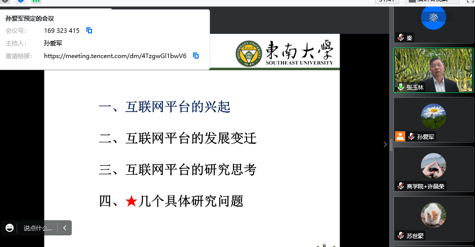 10月27日,商学院邀请东南大学经济管理学院党委委员、副院长、博士生导师张玉林教授为我院师生作题为“互联网平台发展回顾与研究思考”的精彩学术报告。此次学术报告采用线上形式进行,由商学院院长孙爱军教授主持。