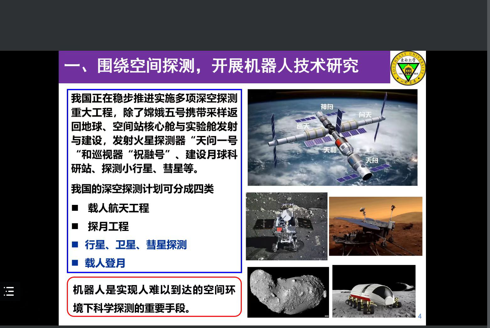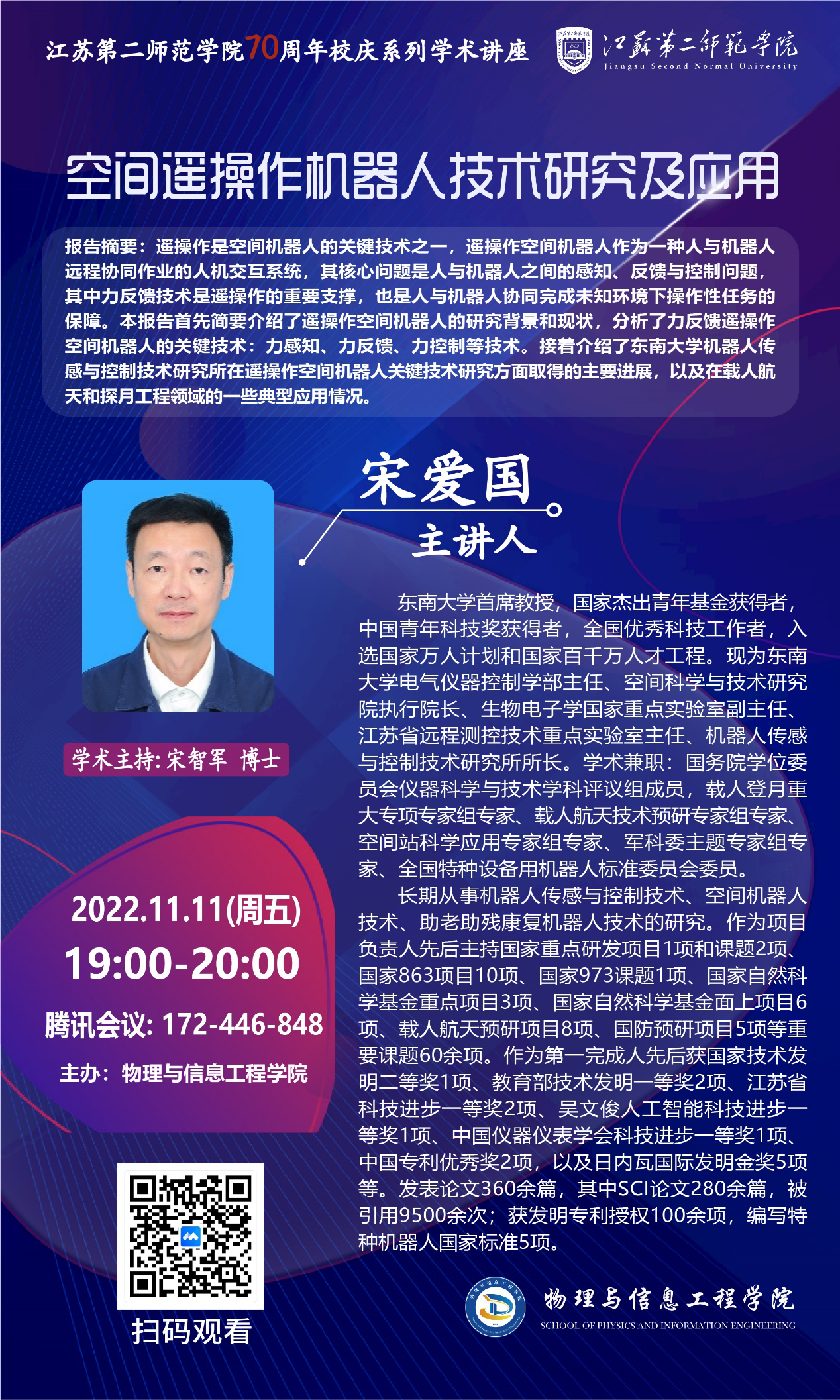2022年11月11日,应物理与信息工程学院邀请,东南大学空间科学与技术研究院执行院长、博士生导师宋爱国教授来院开展学术交流,作题为“空间遥操作机器人技术研究及应用”的专题报告。本次学术报告宋智军博士主持,物信学院全院师生参加。