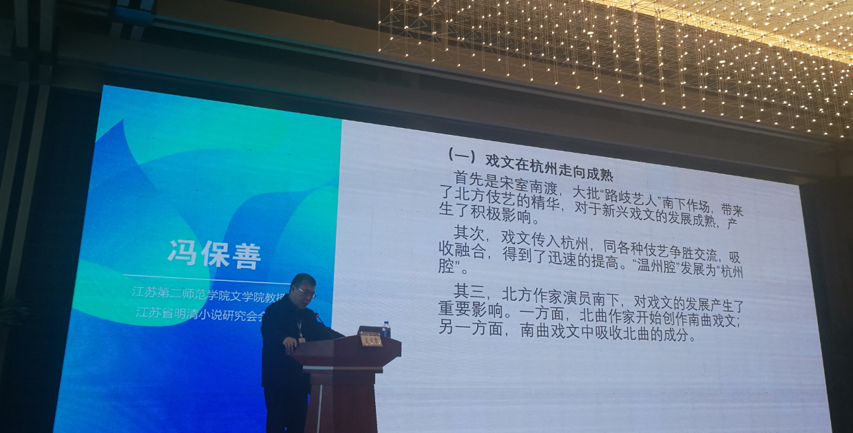 文学院冯保善教授应邀以“水路•戏路•传承之路:传承创新中发展的运河戏曲”为题作主旨发言。他从中国戏曲史上第一个辉煌篇章——元人杂剧引入,指出其前后期两大中心就是分别位于京杭运河首尾两端的城市,即北京与杭州。他分别介绍了古代运河戏曲及戏曲作家的地理分布、运河戏曲艺术的传承创新等。他认为,“水路即戏路”,中国古代戏曲艺术的每一种重要样式,每一个重要发展环节,都与运河有千丝万缕的联系。他从梳理运河戏曲文化资源、保护濒临失传戏曲艺术、加大对相关研究支持力度、整体规划和统筹安排相关建设等方面,提出对“运河戏曲文化长廊”建设的意见和建议。