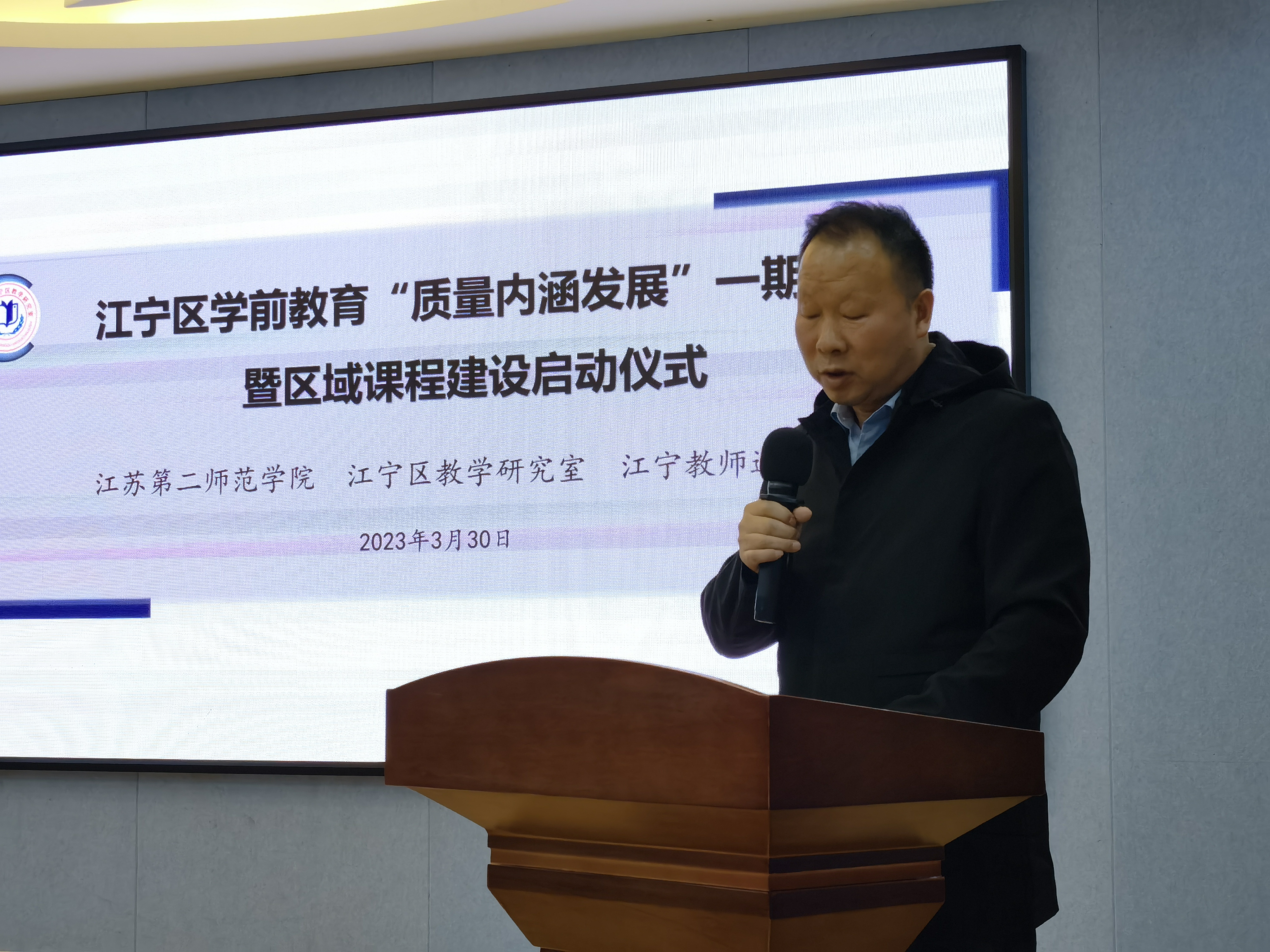 首先,由江宁区教学研究室王闭闩主任和江苏第二师范学院科研处章飞处长致辞。王主任介绍了江宁幼儿教育发展现状,章处长则简要介绍了江苏第二师范学院加强校地双向合作,提升服务能力,建设职前职后融通、教育科研引领、实践取向鲜明办学特色的具体情况。