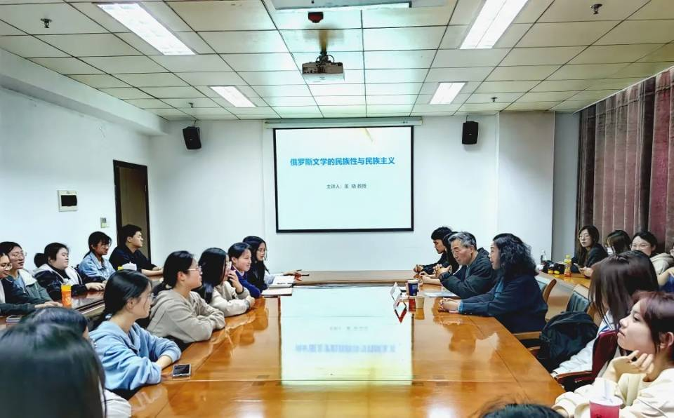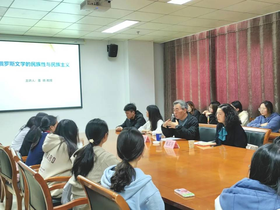 讲座伊始,董晓教授先行引入文学的“世界性”概念,以对主题中文学的“民族性”进行阐述。他指出,一个作家要想写出世界文学,则必须通过本民族的方式表达人类共同的精神建构,民族性与世界性相融合。这也是俄罗斯文学在全球范围内得以传播与传承的原因之一。董教授还提到俄罗斯文学在对自由的呼唤、对土地的眷恋等方面独具特色,这种独特的情感表现是俄罗斯文学中民族性的重要体现。同时,他还介绍了俄罗斯文学中东正教因素带来的独特影响。对于民族主义问题,董晓教授强调了民族主义和民族性之间的区别。