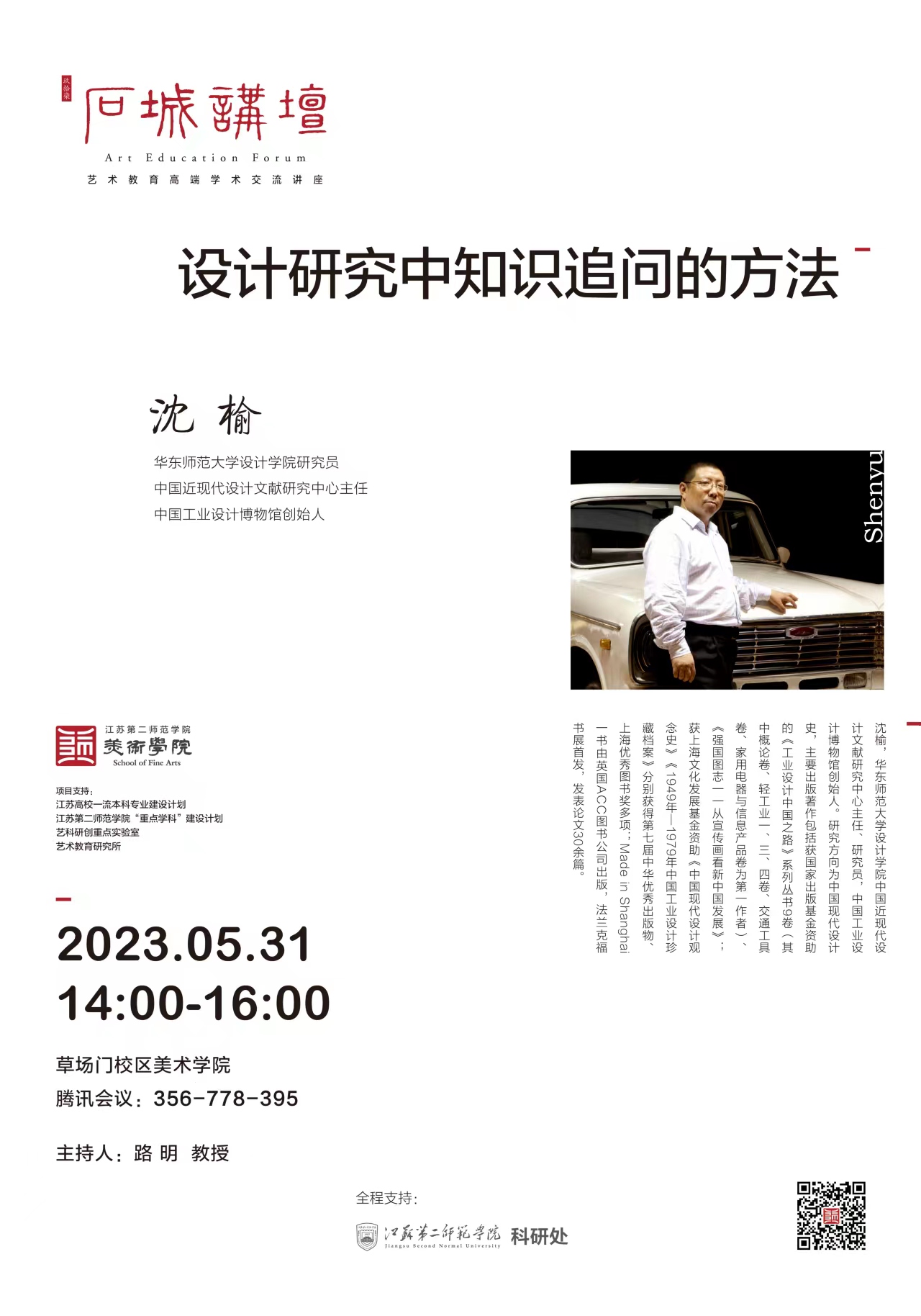 5月31日,华东师范大学设计学院研究员、中国近现代设计文献研究中心主任、中国工业设计博物馆创始人沈榆先生,应邀为美术学院做题为《设计研究中知识追问的方法》线上学术讲座。美术学院全体教师、学生代表线上学习。美术学院院长路明教授主持。