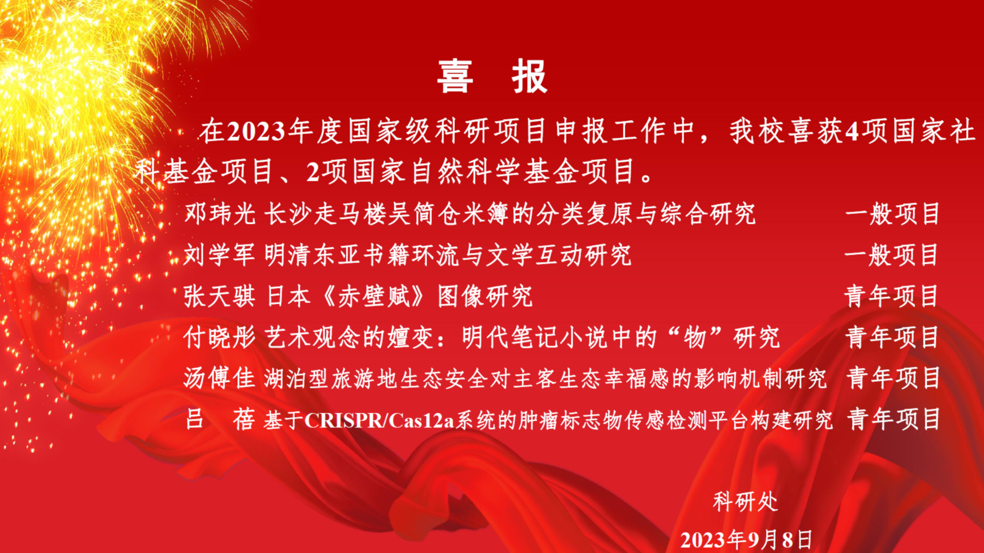 全国哲学社会科学工作办公室、全国艺术科学规划领导小组办公室,近日陆续公示了2023年国家社科基金年度项目和艺术学项目立项名单,我校教师捷报频传,共获批2项一般项目、2项青年项目。年度一般项目是邓玮光老师(马克思主义学院)主持的“长沙走马楼吴简仓米簿的分类复原与综合研究”、刘学军老师(文学院)“明清东亚书籍环流与文学互动研究”。年度青年项目是张天骐老师(文学院)主持的“日本《赤壁赋》图像研究”,艺术学青年项目是付晓彤老师(美术学院)主持的“艺术观念的嬗变:明代笔记小说中的‘物’研究”。
