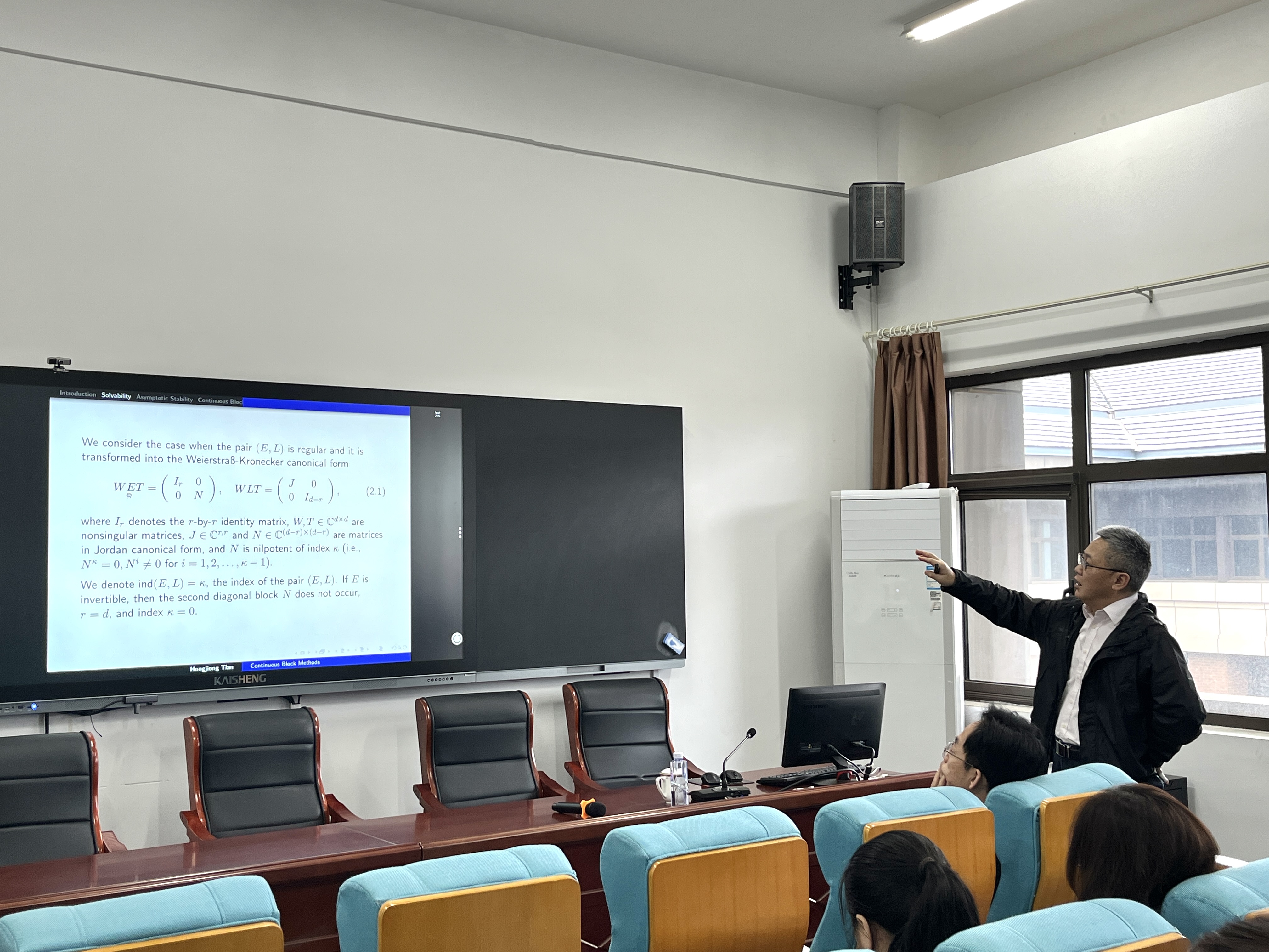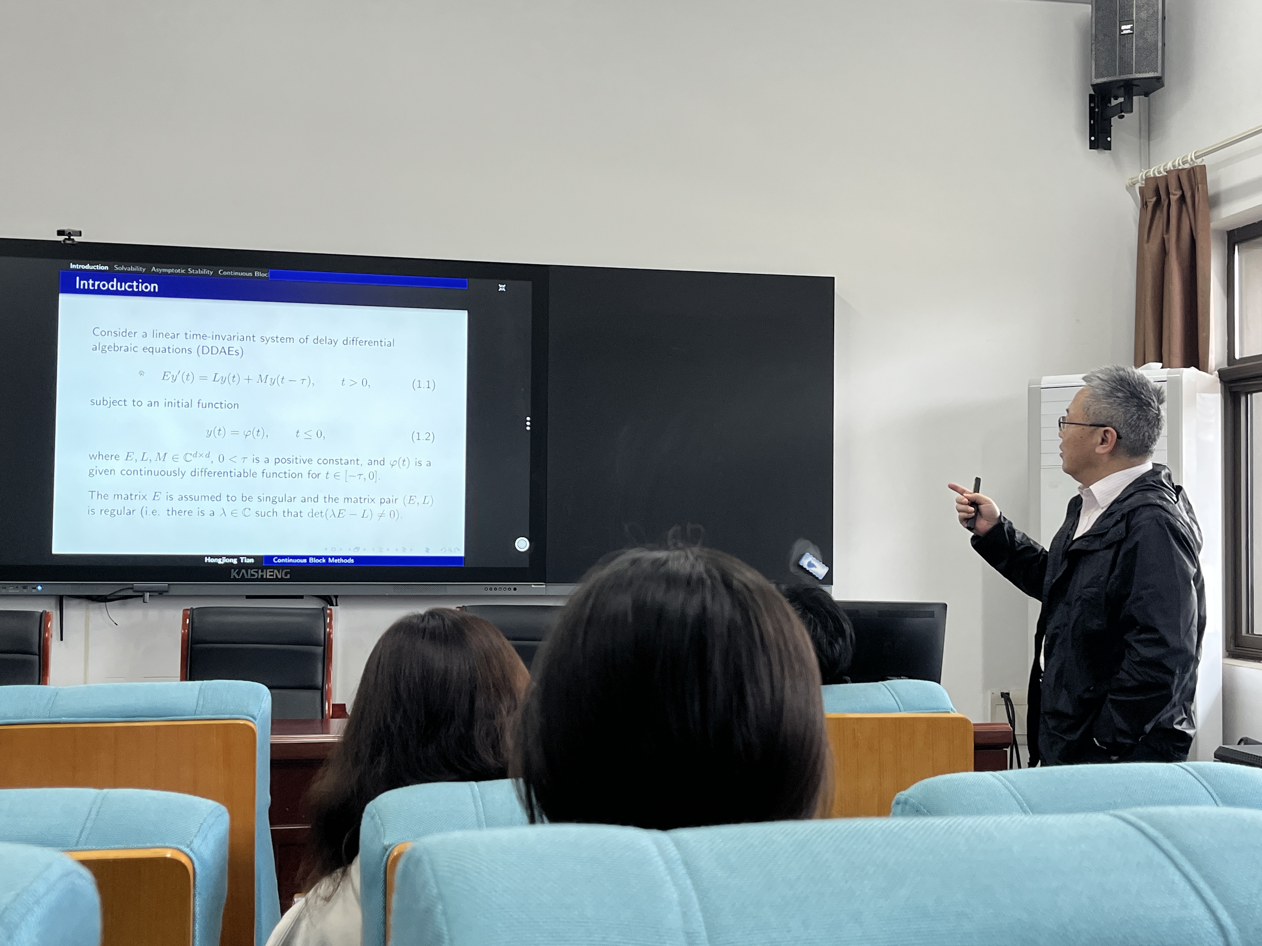 10月31日下午,应我校数学科学学院的邀请,上海师范大学数理学院博士生导师田红炯教授为数学科学学院师生作了题为“Block Methods for Delay Differential-Algebraic Systems”的学术报告。本次报告由卢涛教授主持,学院部分教师及应用统计学专业部分本科生参加了报告并进行了交流。